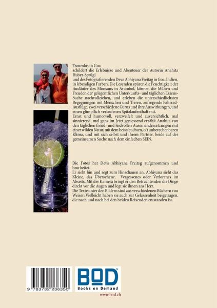 "Traumlos in Goa" schildert die Erlebnisse und Abenteuer der Autorin Anahita Huber-Sprügl und des Fotografierenden Deva Abhiyana Freitag in Goa, Indien, in lebendigen Farben. Die Lesenden spüren die Feuchtigkeit der Ausläufer des Monsuns in Arambol, können die Mühen und Freuden der gelegentlichen Unterkunfts- und täglichen Essens-Suche nachvollziehen, erleben die unterschiedlichsten Begegnungen mit Menschen und Tieren, aufregende Fahrrad-Ausflüge, zwei verschiedene Gurus und ihre Auswirkungen, und einen glimpflich verlaufenen Spitalaufenthalt mit. Ernst und humorvoll, verzweifelt und zuversichtlich, mal sinnierend, mal ganz im Jetzt geniessend erzählt Anahita Huber von den täglichen freud- und leidvollen Auseinandersetzungen mit einer wilden Natur, mit dem heissfeuchten, oft unberechenbaren Klima, und mit sich selbst und ihrem Partner, beide auf der gemeinsamen Suche nach dem einfachen SEIN. Mit Fotos von Deva Abhiyana Freitag, der die Dinge im Verborgenen, im Abseits, der das Kleine sieht, der hinsieht und zum Hinschauen anregt.