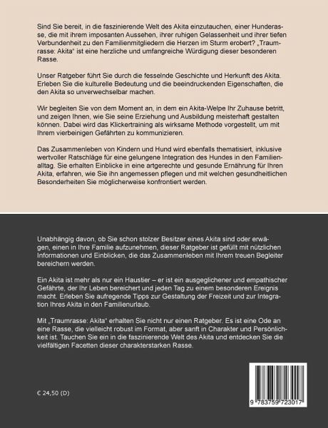 Sind Sie bereit, in die faszinierende Welt des Akita einzutauchen, einer Hunderasse, die mit ihrem imposanten Aussehen, ihrer ruhigen Gelassenheit und ihrer tiefen Verbundenheit zu den Familienmitgliedern die Herzen im Sturm erobert? Traumrasse: Akita ist eine herzliche und umfangreiche Würdigung dieser besonderen Rasse.Unser Ratgeber führt Sie durch die fesselnde Geschichte und Herkunft des Akita. Erleben Sie die kulturelle Bedeutung und die beeindruckenden Eigenschaften, die den Akita so unverwechselbar machen.Wir begleiten Sie von dem Moment an, in dem ein Akita-Welpe Ihr Zuhause betritt, und zeigen Ihnen, wie Sie seine Erziehung und Ausbildung meisterhaft gestalten können. Dabei wird das Klickertraining als wirksame Methode vorgestellt, um mit Ihrem vierbeinigen Gefährten zu kommunizieren.Das Zusammenleben von Kindern und Hund wird ebenfalls thematisiert, inklusive wertvoller Ratschläge für eine gelungene Integration des Hundes in den Familienalltag. Sie erhalten Einblicke ineine artgerechte und gesunde Ernährung für Ihren Akita, erfahren, wie Sie ihn angemessen pflegen und mit welchen gesundheitlichen Besonderheiten Sie möglicherweise konfrontiert werden.Unabhängig davon, ob Sie schon stolzer Besitzer eines Akita sind oder erwägen, einen in Ihre Familie aufzunehmen, dieser Ratgeber ist gefüllt mit nützlichen Informationen und Einblicken, die das Zusammenleben mit Ihrem treuen Begleiter bereichern werden.Ein Akita ist mehr als nur ein Haustier - er ist ein ausgeglichener und empathischer Gefährte, der Ihr Leben bereichert und jeden Tag zu einem besonderen Ereignis macht. Erleben Sie aufregende Tipps zur Gestaltung der Freizeit und zur Integration Ihres Akita in den Familienurlaub.Mit Traumrasse: Akita erhalten Sie nicht nur einen Ratgeber. Es ist eine Ode an eine Rasse, die vielleicht robust im Format, aber sanft in Charakter und Persönlichkeit ist. Tauchen Sie ein in die faszinierende Welt des Akita und entdecken Sie die vielfältigen Facetten diesercharakterstarken Rasse.