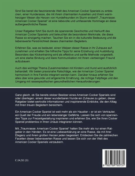 Sind Sie bereit die faszinierende Welt des American Cocker Spaniels zu entdecken, eine Hunderasse, die mit ihrem charmanten Aussehen und ihrem warmherzigen Wesen die Herzen von Hundefreunden im Sturm erobert? Traumrasse: American Cocker Spaniel ist eine liebevolle und umfassende Hommage an diese außergewöhnliche Rasse. Unser Ratgeber führt Sie durch die spannende Geschichte und Herkunft des American Cocker Spaniels und beleuchtet die besonderen Merkmale, die diese Rasse so einzigartig machen. Tauchen Sie ein in die kulturelle Bedeutung und die liebenswerte Persönlichkeit dieses charmanten Begleiters. Erfahren Sie, was es bedeutet, einen Welpen dieser Rasse in Ihr Zuhause aufzunehmen, und erhalten Sie hilfreiche Tipps für seine Erziehung und Ausbildung. Besonders das Klickertraining wird als effektive und sanfte Methode vorgestellt, um eine starke Bindung und klare Kommunikation mit Ihrem vierbeinigen Freund aufzubauen. Auch das wichtige Thema Zusammenleben mit Kindern und Hund wird ausführlich behandelt. Wir bieten praxisnahe Ratschläge, wie der American Cocker Spaniel harmonisch in Ihre Familie integriert werden kann. Darüber hinaus erfahren Sie alles über eine gesunde und artgerechte Ernährung, die richtige Fellpflege und den Umgang mit rassespezifischen gesundheitlichen Herausforderungen. Ganz gleich, ob Sie bereits stolzer Besitzer eines American Cocker Spaniels sind oder überlegen, einem dieser wunderbaren Hunde ein Zuhause zu geben, dieser Ratgeber bietet wertvolle Informationen und inspirierende Einblicke, die den Alltag mit Ihren treuen Begleitern bereichern. Ein American Cocker Spaniel ist weit mehr als ein Haustier - er ist ein vertrauter, ein Quell der Freude und ein lebenslanger Gefährte. Lassen Sie sich von spannenden Tipps zur Freizeitgestaltung inspirieren und erfahren, wie Sie Ihren Cocker Spaniel problemlos in Ihren Urlaub integrieren können. Mit Traumrasse: American Cocker Spaniel halten Sie mehr als nur einen Ratgeber in den Händen. Es ist eine Liebeserklärung an eine Rasse, die mit ihrer Eleganz und ihrem großen Herzen jeden begeistert. Entdecken Sie die zahlreichen Facetten dieser liebenswerten Rasse und lassen Sie sich von der Welt des American Cocker Spaniels verzaubern.
