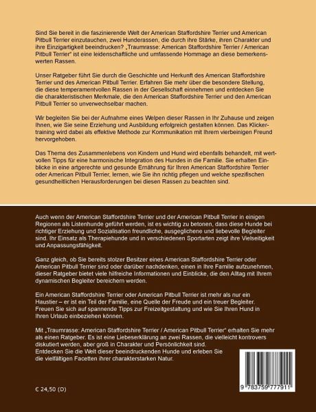 Sind Sie bereit in die faszinierende Welt der American Staffordshire Terrier und American Pitbull Terrier einzutauchen, zwei Hunderassen, die durch ihre Stärke, ihren Charakter und ihre Einzigartigkeit beeindrucken? Traumrasse: American Staffordshire Terrier - American Pitbull Terrier ist eine leidenschaftliche und umfassende Hommage an diese bemerkenswerten Rassen. Unser Ratgeber führt Sie durch die Geschichte und Herkunft des American Staffordshire Terrier und des American Pitbull Terrier. Erfahren Sie mehr über die besondere Stellung, die diese temperamentvollen Rassen in der Gesellschaft einnehmen und entdecken Sie die charakteristischen Merkmale, die den American Staffordshire Terrier und den American Pitbull Terrier so unverwechselbar machen. Wir begleiten Sie bei der Aufnahme eines Welpen dieser Rassen in Ihr Zuhause und zeigen Ihnen, wie Sie seine Erziehung und Ausbildung erfolgreich gestalten können. Das Klickertraining wird dabei als effektive Methode zur Kommunikation mit Ihrem vierbeinigen Freund hervorgehoben. Das Thema des Zusammenlebens von Kindern und Hund wird ebenfalls behandelt, mit wertvollen Tipps für eine harmonische Integration des Hundes in die Familie. Sie erhalten Ein- blicke in eine artgerechte und gesunde Ernährung für Ihren American Staffordshire Terrier oder American Pitbull Terrier, lernen, wie Sie ihn richtig pflegen und welche spezifischen gesundheitlichen Herausforderungen bei diesen Rassen zu beachten sind. Auch wenn der American Staffordshire Terrier und der American Pitbull Terrier in einigen Regionen als Listenhunde geführt werden, ist es wichtig zu betonen, dass diese Hunde bei richtiger Erziehung und Sozialisation freundliche, ausgeglichene und liebevolle Begleiter sind. Ihr Einsatz als Therapiehunde und in verschiedenen Sportarten zeigt ihre Vielseitigkeit und Anpassungsfähigkeit. Ganz gleich, ob Sie bereits stolzer Besitzer eines American Staffordshire Terrier oder American Pitbull Terrier sind oder darüber nachdenken, einen in Ihre Familie aufzunehmen, dieser Ratgeber bietet viele hilfreiche Informationen und Einblicke, die den Alltag mit Ihrem dynamischen Begleiter bereichern werden. Ein American Staffordshire Terrier oder American Pitbull Terrier ist mehr als nur ein Haustier - er ist ein Teil der Familie, eine Quelle der Freude und ein treuer Begleiter. Freuen Sie sich auf spannende Tipps zur Freizeitgestaltung und wie Sie Ihren Hund in Ihren Urlaub einbeziehen können.