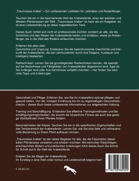 Traumrasse Araber - Ein umfassender Leitfaden für Liebhaber und ReitanfängerTauchen Sie ein in die faszinierende Welt der Araberpferde, einer der edelsten und ältesten Pferderassen der Welt. Traumrasse Araber ist mehr als ein Ratgeber es ist eine Liebeserklärung an diese majestätischen Tiere. Dieses Buch richtet sich nicht an professionelle Züchter, sondern an alle, die die Schönheit und das Wesen der Araberpferde lieben und schätzen, sowie an Reitanfänger, die in die Welt des Reitens eintauchen möchten.Erfahren Sie alles über:Geschichte und Ursprung: Entdecken Sie die beeindruckende Geschichte und Herkunft der Araberpferde, die seit Jahrhunderten durch ihre Eleganz, Ausdauer und Intelligenz bestechen.Reittechniken: Lernen Sie die grundlegenden Reittechniken kennen, die speziell auf die Bedürfnisse und Fähigkeiten von Araberpferden abgestimmt sind. Egal ob Sie Anfänger sind oder Ihre Kenntnisse vertiefen möchten - hier finden Sie wertvolle Tipps und Anleitungen.Gesundheit und Pflege: Erfahren Sie, wie Sie Ihr Araberpferd optimal pflegen und gesund halten. Von der richtigen Ernährung bis hin zu regelmäßigen Gesundheitschecks - dieses Buch bietet umfassende Informationen zur artgerechten Haltung.Training und Beschäftigung: Entdecken Sie effektive Trainingsmethoden und Beschäftigungsmöglichkeiten, die sowohl die körperliche Fitness als auch das geistige Wohlbefinden Ihres Pferdes fördern.Besonderheiten der Rasse: Tauchen Sie ein in die spezifischen Eigenschaften und das Temperament der Araberpferde. Lernen Sie, wie Sie eine tiefe und vertrauensvolle Beziehung zu Ihrem Pferd aufbauen können.Traumrasse Araber ist der ideale Begleiter für alle, die die Faszination dieser edlen Pferderasse verstehen und erleben möchten. Mit wertvollen Ratschlägen, anschaulichen Bildern und praktischen Anleitungen führt dieses Buch Sie Schritt für Schritt durch die Welt der Araberpferde. Erleben Sie die Magie der Araberpferde.Ihr Einstieg in eine Welt voller Anmut und Leidenschaft beginnt hier!