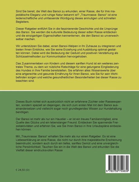 Sind Sie bereit, die Welt des Barsoi zu erkunden, einer Rasse, die für ihre majestätische Eleganz und ruhige Natur bekannt ist? Traumrasse: Barsoi / Borzoi ist eine leidenschaftliche und umfassende Würdigung dieses anmutigen und schnellen Begleiters.Dieser Ratgeber entführt Sie in die faszinierende Geschichte und die Ursprünge des Barsoi. Sie werden die kulturelle Bedeutung dieser edlen Rasse entdecken und die einzigartigen Eigenschaften kennenlernen, die den Barsoi so unverwechselbar machen.Wir unterstützen Sie dabei, einen Barsoi-Welpen in Ihr Zuhause zu integrieren und bieten Ihnen Einblicke, wie Sie seine Erziehung und Ausbildung optimal gestalten können. Dabei wird die Bedeutung der Geduld und positiven Verstärkung als Schlüsselmethoden zur Kommunikation hervorgehoben.Das Zusammenleben von Kindern und diesem sanften Hund ist ein weiteres zentrales Thema, zu dem wir nützliche Ratschläge für eine gelungene Eingliederung des Hundes in Ihre Familie bereitstellen. Sie erfahren alles Wissenswerte über eine artgerechte und gesunde Ernährung für Ihren Barsoi, wie Sie für sein Wohlbefinden sorgen und welche gesundheitlichen Besonderheiten bei dieser Rasse zu beachten sind.Dieses Buch richtet sich ausdrücklich nicht an erfahrene Züchter oder Rasseexperten, sondern speziell an diejenigen, die sich zum ersten Mal mit dem Barsoi auseinandersetzen und vielleicht sogar noch grundlegendes Wissen zur Hundehaltung benötigen.Der Barsoi ist mehr als nur ein Haustier - er ist ein treues Familienmitglied, eine Quelle des Glücks und ein lebenslanger Freund. Entdecken Sie spannende Freizeitaktivitäten und erfahren Sie, wie Sie Ihren Barsoi in Ihre Urlaubspläne einbeziehen können.Mit Traumrasse: Barsoi / Borzoi erhalten Sie mehr als nur einen Ratgeber. Es ist eine Liebeserklärung an eine Rasse, die nicht nur durch ihre majestätische Erscheinung beeindruckt, sondern auch durch ein tiefes, sanftes Gemüt und eine unvergleichliche Persönlichkeit. Tauchen Sie ein in die Welt des Barsoi und erkunden Sie die Vielfalt dieser eindrucksvollen Rasse