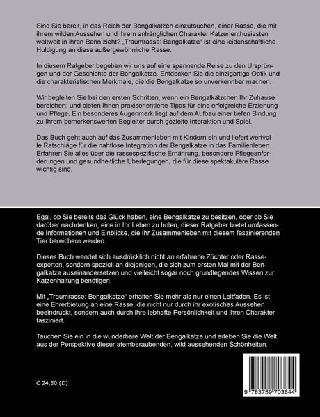 Sind Sie bereit, in das Reich der Bengalkatzen einzutauchen, einer Rasse, die mit ihrem wilden Aussehen und ihrem anhänglichen Charakter Katzenenthusiasten weltweit in ihren Bann zieht? Traumrasse: Bengalkatze ist eine leidenschaftliche Huldigung an diese außergewöhnliche Rasse.In diesem Ratgeber begeben wir uns auf eine spannende Reise zu den Ursprüngen und der Geschichte der Bengalkatze. Entdecken Sie die einzigartige Optik und die charakteristischen Merkmale, die die Bengalkatze so unverkennbar machen.Wir begleiten Sie bei den ersten Schritten, wenn ein Bengalkätzchen Ihr Zuhause bereichert, und bieten Ihnen praxisorientierte Tipps für eine erfolgreiche Erziehung und Pflege. Ein besonderes Augenmerk liegt auf dem Aufbau einer tiefen Bindung zu Ihrem bemerkenswerten Begleiter durch gezielte Interaktion und Spiel.Das Buch geht auch auf das Zusammenleben mit Kindern ein und liefert wertvolle Ratschläge für die nahtlose Integration der Bengalkatze in das Familienleben. Erfahren Sie alles über die rassespezifische Ernährung, besondere Pflegeanforderungen und gesundheitliche Überlegungen, die für diese spektakuläre Rasse wichtig sind.Egal, ob Sie bereits das Glück haben, eine Bengalkatze zu besitzen, oder ob Sie darüber nachdenken, eine in Ihr Leben zu holen, dieser Ratgeber bietet umfassende Informationen und Einblicke, die Ihr Zusammenleben mit diesem faszinierenden Tier bereichern werden.Dieses Buch wendet sich ausdrücklich nicht an erfahrene Züchter oder Rasseexperten, sondern speziell an diejenigen, die sich zum ersten Mal mit der Bengalkatze auseinandersetzen und vielleicht sogar noch grundlegendes Wissen zur Katzenhaltung benötigen.Mit Traumrasse: Bengalkatze erhalten Sie mehr als nur einen Leitfaden. Es ist eine Ehrerbietung an eine Rasse, die nicht nur durch ihr exotisches Aussehen beeindruckt, sondern auch durch ihre lebhafte Persönlichkeit und ihren Charakter fasziniert.Tauchen Sie ein in die wunderbare Welt der Bengalkatze und erleben Sie die Welt aus der Perspektive dieser atemberaubenden, wild aussehenden Schönheiten.