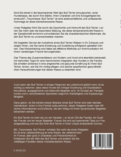Sind Sie bereit, in die faszinierende Welt des Bull Terrier einzutauchen, einer Hunderasse, die durch ihre Stärke, ihren Charakter und ihre Einzigartigkeit beeindruckt? Traumrasse: Bull Terrier ist eine leidenschaftliche und umfassende Hommage an diese bemerkenswerte Rasse.Unser Ratgeber führt Sie durch die Geschichte und Herkunft des Bull Terrier. Lernen Sie mehr über die besondere Stellung, die diese temperamentvolle Rasse in der Gesellschaft einnimmt, und entdecken Sie die charakteristischen Merkmale, die den Bull Terrier so unverwechselbar machen.Wir begleiten Sie bei der Aufnahme eines Bull Terrier-Welpen in Ihr Zuhause und zeigen Ihnen, wie Sie seine Erziehung und Ausbildung erfolgreich gestalten können. Das Klickertraining wird dabei als effektive Methode zur Kommunikation mit Ihrem vierbeinigen Freund hervorgehoben.Das Thema des Zusammenlebens von Kindern und Hund wird ebenfalls behandelt, mit wertvollen Tipps für eine harmonische Integration des Hundes in die Familie. Sie erhalten Einblicke in eine artgerechte und gesunde Ernährung für Ihren Bull Terrier, lernen, wie Sie ihn richtig pflegen und welche spezifischen gesundheitlichen Herausforderungen bei dieser Rasse zu beachten sind.Auch wenn der Bull Terrier in einigen Regionen als Listenhund geführt wird, ist es wichtig zu betonen, dass diese Hunde bei richtiger Erziehung und Sozialisation freundliche, ausgeglichene und liebevolle Begleiter sind. Ihr Einsatz als Therapiehunde und in verschiedenen Sportarten zeigt ihre Vielseitigkeit und Anpassungsfähigkeit.Ganz gleich, ob Sie bereits stolzer Besitzer eines Bull Terrier sind oder darüber nachdenken, einen in Ihre Familie aufzunehmen, dieser Ratgeber bietet viele hilfreiche Informationen und Einblicke, die den Alltag mit Ihrem dynamischen Begleiter bereichern werden.Ein Bull Terrier ist mehr als nur ein Haustier - er ist ein Teil der Familie, ein Quell der Freude und ein treuer Begleiter. Freuen Sie sich auf spannende Tipps zur Freizeitgestaltung und wie Sie Ihren Bull Terrier in Ihren Urlaub einbeziehen können.Mit Traumrasse: Bull Terrier erhalten Sie mehr als einen Ratgeber. Es ist eine Liebeserklärung an eine Rasse, die vielleicht klein im Format, aber groß in Charakter und Persönlichkeit ist. Entdecken Sie die Welt des Bull Terrier und erleben Sie die vielfältigen Facetten dieser charakterstarken Rasse.