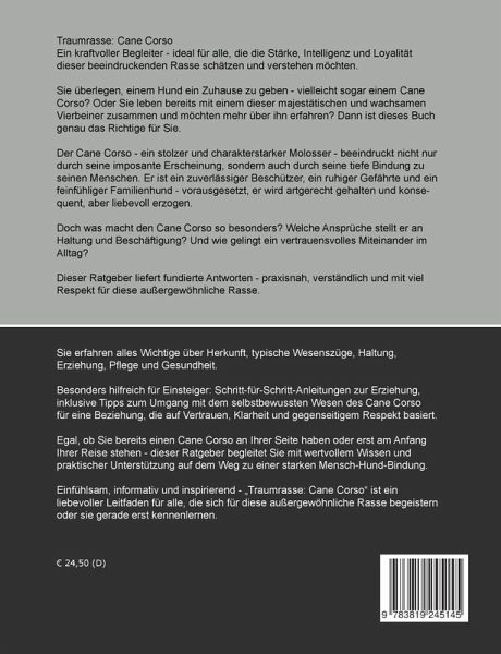 Traumrasse: Cane Corso Ein kraftvoller Begleiter - ideal für alle, die die Stärke, Intelligenz und Loyalität dieser beeindruckenden Rasse schätzen und verstehen möchten. Sie überlegen, einem Hund ein Zuhause zu geben - vielleicht sogar einem Cane Corso? Oder Sie leben bereits mit einem dieser majestätischen und wachsamen Vierbeiner zusammen und möchten mehr über ihn erfahren? Dann ist dieses Buch genau das Richtige für Sie. Der Cane Corso - ein stolzer und charakterstarker Molosser - beeindruckt nicht nur durch seine imposante Erscheinung, sondern auch durch seine tiefe Bindung zu seinen Menschen. Er ist ein zuverlässiger Beschützer, ein ruhiger Gefährte und ein feinfühliger Familienhund - vorausgesetzt, er wird artgerecht gehalten und konsequent, aber liebevoll erzogen. Doch was macht den Cane Corso so besonders? Welche Ansprüche stellt er an Haltung und Beschäftigung? Und wie gelingt ein vertrauensvolles Miteinander im Alltag? Dieser Ratgeber liefert fundierte Antworten - praxisnah, verständlich und mit viel Respekt für diese außergewöhnliche Rasse. Sie erfahren alles Wichtige über Herkunft, typische Wesenszüge, Haltung, Erziehung, Pflege und Gesundheit. Besonders hilfreich für Einsteiger: Schritt-für-Schritt-Anleitungen zur Erziehung, inklusive Tipps zum Umgang mit dem selbstbewussten Wesen des Cane Corso für eine Beziehung, die auf Vertrauen, Klarheit und gegenseitigem Respekt basiert. Egal, ob Sie bereits einen Cane Corso an Ihrer Seite haben oder erst am Anfang Ihrer Reise stehen - dieser Ratgeber begleitet Sie mit wertvollem Wissen und praktischer Unterstützung auf dem Weg zu einer starken Mensch-Hund-Bindung. Einfühlsam, informativ und inspirierend - Traumrasse: Cane Corso ist ein liebevoller Leitfaden für alle, die sich für diese außergewöhnliche Rasse begeistern oder sie gerade erst kennenlernen.