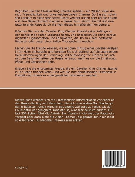 Begrüßen Sie den Cavalier King Charles Spaniel: ein Wesen voller Anmut, Freundlichkeit und unverwechselbarem Charme. Ob Sie sich schon seit Langem in diese besondere Rasse verliebt haben oder ob Sie gerade erst ihre Bekanntschaft machen, dieses Buch nimmt Sie mit auf eine faszinierende Reise durch die Welt dieses hinreißenden Vierbeiners.Erfahren Sie, wie der Cavalier King Charles Spaniel seine Anfänge an den königlichen Höfen Englands nahm, und entdecken Sie seine herausragenden Eigenschaften und Fähigkeiten, die ihn zu einem perfekten Begleiter oder sogar einen tollen Therapiehund machen.Lernen Sie die Freude kennen, die mit dem Einzug eines Cavalier-Welpen in Ihr Heim einhergeht und bereiten Sie sich optimal auf die spannenden Herausforderungen der Erziehung und Ausbildung vor. Machen Sie sich mit den Besonderheiten der Rasse vertraut, wenn es um die Ernährung, Pflege und Gesundheit geht.Erleben Sie die einzigartige Freude, die ein Cavalier King Charles Spaniel in Ihr Leben bringen kann, und wie Sie Ihre gemeinsamen Erlebnisse in Freizeit und Urlaub zu unvergesslichen Momenten machen.Dieses Buch wendet sich mit umfassenden Informationen vor allem an den Rasse-Neuling und Menschen, die sich zum ersten Mal überhaupt damit befassen, einen Hund in das eigene Zuhause zu holen. Ob der Collie dafür der geeignete Kandidat ist, wird hier deutlich erklärt. Auf fast 200 Seiten führt die Autorin Sie intensiv in die Welt der Rasse ein, vergisst aber auch nicht die vielen Themen, die gerade den noch nicht so erfahrenen Hundehalter interessieren sollten.