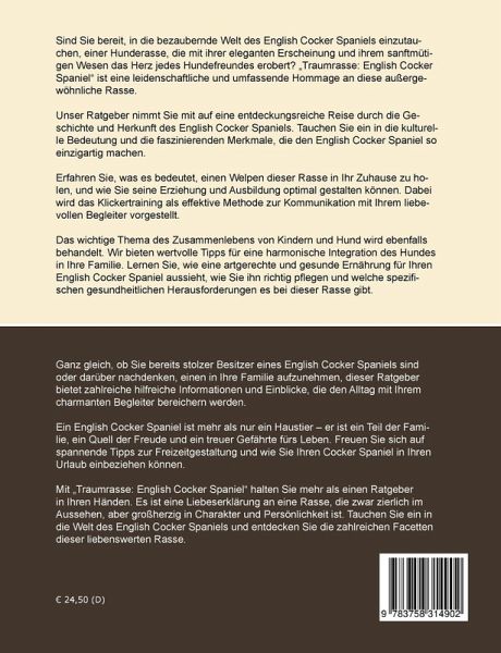Sind Sie bereit, in die bezaubernde Welt des English Cocker Spaniels einzutauchen, einer Hunderasse, die mit ihrer eleganten Erscheinung und ihrem sanftmütigen Wesen das Herz jedes Hundefreundes erobert? Traumrasse: English Cocker Spaniel ist eine leidenschaftliche und umfassende Hommage an diese außergewöhnliche Rasse.Unser Ratgeber nimmt Sie mit auf eine entdeckungsreiche Reise durch die Geschichte und Herkunft des English Cocker Spaniels. Tauchen Sie ein in die kulturelle Bedeutung und die faszinierenden Merkmale, die den English Cocker Spaniel so einzigartig machen.Erfahren Sie, was es bedeutet, einen Welpen dieser Rasse in Ihr Zuhause zu holen, und wie Sie seine Erziehung und Ausbildung optimal gestalten können. Dabei wird das Klickertraining als effektive Methode zur Kommunikation mit Ihrem liebevollen Begleiter vorgestellt.Das wichtige Thema des Zusammenlebens von Kindern und Hund wird ebenfalls behandelt. Wir bieten wertvolle Tipps für eine harmonische Integration des Hundes in Ihre Familie. Lernen Sie, wie eine artgerechte und gesunde Ernährung für Ihren English Cocker Spaniel aussieht, wie Sie ihn richtig pflegen und welche spezifischen gesundheitlichen Herausforderungen es bei dieser Rasse gibt.Ganz gleich, ob Sie bereits stolzer Besitzer eines English Cocker Spaniels sind oder darüber nachdenken, einen in Ihre Familie aufzunehmen, dieser Ratgeber bietet zahlreiche hilfreiche Informationen und Einblicke, die den Alltag mit Ihrem charmanten Begleiter bereichern werden.Ein English Cocker Spaniel ist mehr als nur ein Haustier - er ist ein Teil der Familie, ein Quell der Freude und ein treuer Gefährte fürs Leben. Freuen Sie sich auf spannende Tipps zur Freizeitgestaltung und wie Sie Ihren Cocker Spaniel in Ihren Urlaub einbeziehen können.Mit Traumrasse: English Cocker Spaniel halten Sie mehr als einen Ratgeber in Ihren Händen. Es ist eine Liebeserklärung an eine Rasse, die zwar zierlich im Aussehen, aber großherzig in Charakter und Persönlichkeit ist. Tauchen Sie ein in die Welt des English Cocker Spaniels und entdecken Sie die zahlreichen Facetten dieser liebenswerten Rasse.
