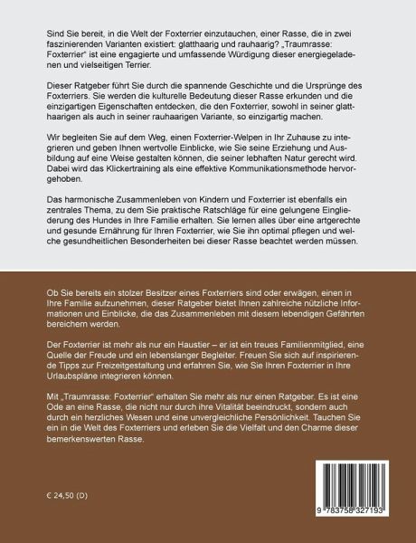 Sind Sie bereit, in die Welt der Foxterrier einzutauchen, einer Rasse, die in zwei faszinierenden Varianten existiert: glatthaarig und rauhaarig? Traumrasse: Foxterrier ist eine engagierte und umfassende Würdigung dieser energiegeladenen und vielseitigen Terrier.Dieser Ratgeber führt Sie durch die spannende Geschichte und die Ursprünge des Foxterriers. Sie werden die kulturelle Bedeutung dieser Rasse erkunden und die einzigartigen Eigenschaften entdecken, die den Foxterrier, sowohl in seiner glatthaarigen als auch in seiner rauhaarigen Variante, so einzigartig machen.Wir begleiten Sie auf dem Weg, einen Foxterrier-Welpen in Ihr Zuhause zu integrieren und geben Ihnen wertvolle Einblicke, wie Sie seine Erziehung und Ausbildung auf eine Weise gestalten können, die seiner lebhaften Natur gerecht wird. Dabei wird das Klickertraining als eine effektive Kommunikationsmethode hervorgehoben.Das harmonische Zusammenleben von Kindern und Foxterrier ist ebenfalls ein zentrales Thema, zu dem Sie praktische Ratschläge für eine gelungene Eingliederung des Hundes in Ihre Familie erhalten. Sie lernen alles über eine artgerechte und gesunde Ernährung für Ihren Foxterrier, wie Sie ihn optimal pflegen und welche gesundheitlichen Besonderheiten bei dieser Rasse beachtet werden müssen.Ob Sie bereits ein stolzer Besitzer eines Foxterriers sind oder erwägen, einen in Ihre Familie aufzunehmen, dieser Ratgeber bietet Ihnen zahlreiche nützliche Informationen und Einblicke, die das Zusammenleben mit diesem lebendigen Gefährten bereichern werden.Der Foxterrier ist mehr als nur ein Haustier - er ist ein treues Familienmitglied, eine Quelle der Freude und ein lebenslanger Begleiter. Freuen Sie sich auf inspirierende Tipps zur Freizeitgestaltung und erfahren Sie, wie Sie Ihren Foxterrier in Ihre Urlaubspläne integrieren können.Mit Traumrasse: Foxterrier erhalten Sie mehr als nur einen Ratgeber. Es ist eine Ode an eine Rasse, die nicht nur durch ihre Vitalität beeindruckt, sondern auch durch ein herzliches Wesen und eine unvergleichliche Persönlichkeit. Tauchen Sie ein in die Welt des Foxterriers und erleben Sie die Vielfalt und den Charme dieser bemerkenswerten Rasse.