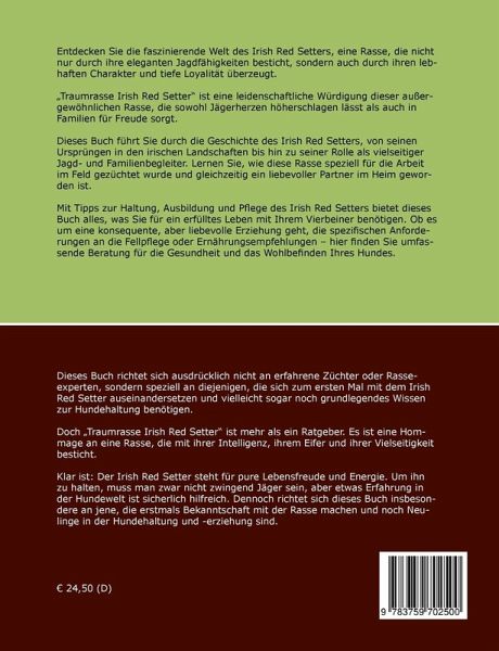 Entdecken Sie die faszinierende Welt des Irish Red Setters, eine Rasse, die nicht nur durch ihre eleganten Jagdfähigkeiten besticht, sondern auch durch ihren lebhaften Charakter und tiefe Loyalität überzeugt.Traumrasse Irish Red Setter ist eine leidenschaftliche Würdigung dieser außergewöhnlichen Rasse, die sowohl Jägerherzen höherschlagen lässt als auch in Familien für Freude sorgt.Dieses Buch führt Sie durch die Geschichte des Irish Red Setters, von seinen Ursprüngen in den irischen Landschaften bis hin zu seiner Rolle als vielseitiger Jagd- und Familienbegleiter. Lernen Sie, wie diese Rasse speziell für die Arbeit im Feld gezüchtet wurde und gleichzeitig ein liebevoller Partner im Heim geworden ist.Mit Tipps zur Haltung, Ausbildung und Pflege des Irish Red Setters bietet dieses Buch alles, was Sie für ein erfülltes Leben mit Ihrem Vierbeiner benötigen. Ob es um eine konsequente, aber liebevolle Erziehung geht, die spezifischen Anforderungen an die Fellpflege oder Ernährungsempfehlungen - hier finden Sie umfassende Beratung für die Gesundheit und das Wohlbefinden Ihres Hundes.Dieses Buch richtet sich ausdrücklich nicht an erfahrene Züchter oder Rasseexperten, sondern speziell an diejenigen, die sich zum ersten Mal mit dem Irish Red Setter auseinandersetzen und vielleicht sogar noch grundlegendes Wissen zur Hundehaltung benötigen.Doch Traumrasse Irish Red Setter ist mehr als ein Ratgeber. Es ist eine Hommage an eine Rasse, die mit ihrer Intelligenz, ihrem Eifer und ihrer Vielseitigkeit besticht. Klar ist: Der Irish Red Setter steht für pure Lebensfreude und Energie. Um ihn zu halten, muss man zwar nicht zwingend Jäger sein, aber etwas Erfahrung in der Hundewelt ist sicherlich hilfreich. Dennoch richtet sich dieses Buch insbesondere an jene, die erstmals Bekanntschaft mit der Rasse machen und noch Neulinge in der Hundehaltung und -erziehung sind.