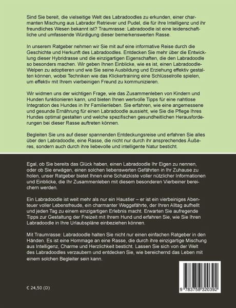 Sind Sie bereit, die vielseitige Welt des Labradoodles zu erkunden, einer charmanten Mischung aus Labrador Retriever und Pudel, die für ihre Intelligenz und ihr freundliches Wesen bekannt ist? Traumrasse: Labradoodle ist eine leidenschaftliche und umfassende Würdigung dieser bemerkenswerten Rasse.In unserem Ratgeber nehmen wir Sie mit auf eine informative Reise durch die Geschichte und Herkunft des Labradoodles. Entdecken Sie mehr über die Entwicklung dieser Hybridrasse und die einzigartigen Eigenschaften, die den Labradoodle so besonders machen. Wir geben Ihnen Einblicke, wie es ist, einen Labradoodle-Welpen zu adoptieren und wie Sie seine Ausbildung und Erziehung effektiv gestalten können, wobei Techniken wie das Klickertraining eine Schlüsselrolle spielen, um effektiv mit Ihrem vierbeinigen Freund zu kommunizieren.Wir widmen uns der wichtigen Frage, wie das Zusammenleben von Kindern und Hunden funktionieren kann, und bieten Ihnen wertvolle Tipps für eine nahtlose Integration des Hundes in Ihr Familienleben. Sie erfahren, wie eine angemessene und gesunde Ernährung für einen Labradoodle aussieht, wie Sie die Pflege Ihres Hundes optimal gestalten und welche spezifischen gesundheitlichen Herausforderungen bei dieser Rasse auftreten können.Begleiten Sie uns auf dieser spannenden Entdeckungsreise und erfahren Sie alles über den Labradoodle, eine Rasse, die nicht nur durch ihr ansprechendes Äußeres, sondern auch durch ihre liebevolle und intelligente Natur besticht.Egal, ob Sie bereits das Glück haben, einen Labradoodle Ihr Eigen zu nennen, oder ob Sie erwägen, einen solchen liebenswerten Gefährten in Ihr Zuhause zu holen, unser Ratgeber bietet Ihnen eine Schatzkiste voller nützlicher Informationen und Einblicke, die Ihr Zusammenleben mit diesem besonderen Vierbeiner bereichern werden.Ein Labradoodle ist weit mehr als nur ein Haustier - er ist ein vierbeiniges Abenteuer voller Lebensfreude, ein charmanter Weggefährte, der Ihren Alltag aufhellt und jeden Tag zu einem einzigartigen Erlebnis macht. Erwarten Sie aufregende Tipps zur Gestaltung der Freizeit mit Ihrem Hund und erfahren Sie, wie Sie Ihren Labradoodle in Ihre Urlaubspläne einbeziehen können.Mit Traumrasse: Labradoodle halten Sie nicht nur einen einfachen Ratgeber in den Händen. Es ist eine Hommage an eine Rasse, die durch ihre einzigartige Mischung aus Intelligenz, Charme und Herzlichkeit besticht. Lassen Sie sich von der Welt des Labradoodles verzaubern und entdecken Sie, wie bereichernd