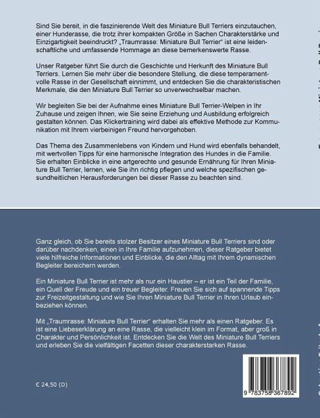 Sind Sie bereit, in die faszinierende Welt des Miniature Bull Terriers einzutauchen, einer Hunderasse, die trotz ihrer kompakten Größe in Sachen Charakterstärke und Einzigartigkeit beeindruckt? Traumrasse: Miniature Bull Terrier ist eine leidenschaftliche und umfassende Hommage an diese bemerkenswerte Rasse.Unser Ratgeber führt Sie durch die Geschichte und Herkunft des Miniature Bull Terriers. Lernen Sie mehr über die besondere Stellung, die diese temperamentvolle Rasse in der Gesellschaft einnimmt, und entdecken Sie die charakteristischen Merkmale, die den Miniature Bull Terrier so unverwechselbar machen.Wir begleiten Sie bei der Aufnahme eines Miniature Bull Terrier-Welpen in Ihr Zuhause und zeigen Ihnen, wie Sie seine Erziehung und Ausbildung erfolgreich gestalten können. Das Klickertraining wird dabei als effektive Methode zur Kommunikation mit Ihrem vierbeinigen Freund hervorgehoben.Das Thema des Zusammenlebens von Kindern und Hund wird ebenfalls behandelt, mit wertvollen Tipps für eine harmonische Integration des Hundes in die Familie. Sie erhalten Einblicke in eine artgerechte und gesunde Ernährung für Ihren Miniature Bull Terrier, lernen, wie Sie ihn richtig pflegen und welche spezifischen gesundheitlichen Herausforderungen bei dieser Rasse zu beachten sind.Ganz gleich, ob Sie bereits stolzer Besitzer eines Miniature Bull Terriers sind oder darüber nachdenken, einen in Ihre Familie aufzunehmen, dieser Ratgeber bietet zahlreiche hilfreiche Informationen und Einblicke, die den Alltag mit Ihrem dynamischen Begleiter bereichern werden.Ein Miniature Bull Terrier ist mehr als nur ein Haustier - er ist ein Teil der Familie, ein Quell der Freude und ein treuer Begleiter. Freuen Sie sich auf spannende Tipps zur Freizeitgestaltung und wie Sie Ihren Miniature Bull Terrier in Ihren Urlaub einbeziehen können.Mit Traumrasse: Miniature Bull Terrier erhalten Sie mehr als einen Ratgeber. Es ist eine Liebeserklärung an eine Rasse, die vielleicht klein im Format, aber groß in Charakter und Persönlichkeit ist. Entdecken Sie die Welt des Miniature Bull Terriers und erleben Sie die vielfältigen Facetten dieser charakterstarken Rasse.