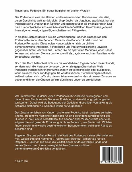 Traumrasse Podenco: Ein treuer Begleiter mit uralten WurzelnDer Podenco ist eine der ältesten und faszinierendsten Hunderassen der Welt, deren Geschichte weit zurückreicht. Ursprünglich als Jagdhund gezüchtet, hat der Podenco seine Ursprünge in Ägypten und gelangte über die Phönizier nach Spanien. Hier entwickelte sich eine beeindruckende Vielfalt an Unterrassen, jede mit ihren eigenen einzigartigen Eigenschaften und Fähigkeiten.In diesem Buch entdecken Sie die verschiedenen Podenco-Rassen wie den Podenco Ibicenco, den Podenco Canario, den Podenco Andaluz und den Podenco Portugués. Diese edlen Hunde zeichnen sich durch ihre bemerkenswerte Intelligenz, Schnelligkeit und ihre unvergleichliche Loyalität gegenüber ihren Besitzern aus. Lernen Sie die speziellen Merkmale jeder Rasse kennen und erfahren Sie, warum sie sowohl als Jagd- wie auch als Familienhunde so geschätzt werden.Doch das Buch beleuchtet nicht nur die wunderbaren Eigenschaften dieser Hunde, sondern auch die Herausforderungen, denen sie gegenüberstehen. Viele Podencos werden in ihren Herkunftsländern oft vernachlässigt oder ausgesetzt, wenn sie nicht mehr zur Jagd genutzt werden können. Tierschutzorganisationen weltweit setzen sich dafür ein, diesen liebenswerten Hunden ein neues Zuhause zu geben und ihnen die Chance auf ein glückliches Leben zu ermöglichen.Wir unterstützen Sie dabei, einen Podenco in Ihr Zuhause zu integrieren und bieten Ihnen Einblicke, wie Sie seine Erziehung und Ausbildung optimal gestalten können. Dabei wird die Bedeutung der Geduld und positiven Verstärkung als Schlüsselmethoden zur Kommunikation hervorgehoben.Das Zusammenleben von Kindern und einem Podenco ist ein weiteres zentrales Thema, zu dem wir nützliche Ratschläge für eine gelungene Eingliederung des Hundes in Ihre Familie bereitstellen. Sie erfahren alles Wissenswerte über eine artgerechte und gesunde Ernährung für Ihren Podenco, wie Sie für sein Wohlbefinden sorgen und welche gesundheitlichen Besonderheiten bei dieser Rasse zu beachten sind.Begleiten Sie uns auf eine Reise in die Welt des Podencos - einer Welt voller Anmut, Geschichte und Hoffnung. Traumrasse Podenco ist mehr als nur ein Ratgeber - Tauchen Sie ein in die Vielfalt dieser eindrucksvollen Hunde und lassen Sie sich von ihrem unvergleichlichen Charme und ihrer bemerkenswerten Geschichte verzaubern.