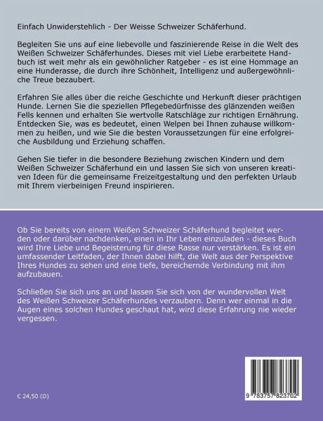 Einfach Unwiderstehlich - Der Weisse Schweizer Schäferhund.Begleiten Sie uns auf eine liebevolle und faszinierende Reise in die Welt des Weißen Schweizer Schäferhundes. Dieses mit viel Liebe erarbeitete Handbuch ist weit mehr als ein gewöhnlicher Ratgeber - es ist eine Hommage an eine Hunderasse, die durch ihre Schönheit, Intelligenz und außergewöhnliche Treue bezaubert.Erfahren Sie alles über die reiche Geschichte und Herkunft dieser prächtigen Hunde. Lernen Sie die speziellen Pflegebedürfnisse des glänzenden weißen Fells kennen und erhalten Sie wertvolle Ratschläge zur richtigen Ernährung. Entdecken Sie, was es bedeutet, einen Welpen bei Ihnen zuhause willkommen zu heißen, und wie Sie die besten Voraussetzungen für eine erfolgreiche Ausbildung und Erziehung schaffen.Gehen Sie tiefer in die besondere Beziehung zwischen Kindern und dem Weißen Schweizer Schäferhund ein und lassen Sie sich von unseren kreativen Ideen für die gemeinsame Freizeitgestaltung und den perfekten Urlaub mit Ihrem vierbeinigen Freund inspirieren.Ob Sie bereits von einem Weißen Schweizer Schäferhund begleitet werden oder darüber nachdenken, einen in Ihr Leben einzuladen - dieses Buch wird Ihre Liebe und Begeisterung für diese Rasse nur verstärken. Es ist ein umfassender Leitfaden, der Ihnen dabei hilft, die Welt aus der Perspektive Ihres Hundes zu sehen und eine tiefe, bereichernde Verbindung mit ihm aufzubauen.Schließen Sie sich uns an und lassen Sie sich von der wundervollen Welt des Weißen Schweizer Schäferhundes verzaubern. Denn wer einmal in die Augen eines solchen Hundes geschaut hat, wird diese Erfahrung nie wieder vergessen.