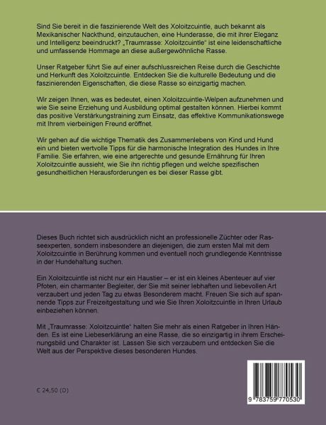 Sind Sie bereit in die faszinierende Welt des Xoloitzcuintle, auch bekannt als Mexikanischer Nackthund, einzutauchen, eine Hunderasse, die mit ihrer Eleganz und Intelligenz beeindruckt? Traumrasse: Xoloitzcuintle ist eine leidenschaftliche und umfassende Hommage an diese außergewöhnliche Rasse.Unser Ratgeber führt Sie auf einer aufschlussreichen Reise durch die Geschichte und Herkunft des Xoloitzcuintle. Entdecken Sie die kulturelle Bedeutung und die faszinierenden Eigenschaften, die diese Rasse so einzigartig machen.Wir zeigen Ihnen, was es bedeutet, einen Xoloitzcuintle-Welpen aufzunehmen und wie Sie seine Erziehung und Ausbildung optimal gestalten können. Hierbei kommt das positive Verstärkungstraining zum Einsatz, das effektive Kommunikationswege mit Ihrem vierbeinigen Freund eröffnet.Wir gehen auf die wichtige Thematik des Zusammenlebens von Kind und Hund ein und bieten wertvolle Tipps für die harmonische Integration des Hundes in Ihre Familie. Sie erfahren, wie eine artgerechte und gesunde Ernährung für Ihren Xoloitzcuintle aussieht, wie Sie ihn richtig pflegen und welche spezifischen gesundheitlichen Herausforderungen es bei dieser Rasse gibt.Dieses Buch richtet sich ausdrücklich nicht an professionelle Züchter oder Rasseexperten, sondern insbesondere an diejenigen, die zum ersten Mal mit dem Xoloitzcuintle in Berührung kommen und eventuell noch grundlegende Kenntnisse in der Hundehaltung suchen.Ein Xoloitzcuintle ist nicht nur ein Haustier - er ist ein kleines Abenteuer auf vier Pfoten, ein charmanter Begleiter, der Sie mit seiner lebhaften und liebevollen Art verzaubert und jeden Tag zu etwas Besonderem macht. Freuen Sie sich auf spannende Tipps zur Freizeitgestaltung und wie Sie Ihren Xoloitzcuintle in Ihren Urlaub einbeziehen können.Mit Traumrasse: Xoloitzcuintle halten Sie mehr als einen Ratgeber in Ihren Händen. Es ist eine Liebeserklärung an eine Rasse, die so einzigartig in ihrem Erscheinungsbild und Charakter ist. Lassen Sie sich verzaubern und entdecken Sie die Welt aus der Perspektive dieses besonderen Hundes.