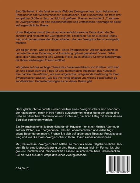Sind Sie bereit, in die faszinierende Welt des Zwergpinschers, auch bekannt als Rehpinscher oder Miniaturpinscher, einzutauchen, eine Hunderasse, die trotz ihrer kompakten Größe in Herz und Mut mit größeren Rassen konkurriert? Traumrasse: Zwergpinscher ist eine leidenschaftliche und umfassende Hommage an diese außergewöhnliche Rasse.Unser Ratgeber nimmt Sie mit auf eine aufschlussreiche Reise durch die Geschichte und Herkunft des Zwergpinschers. Entdecken Sie die kulturelle Bedeutung und die faszinierenden Eigenschaften, die den Zwergpinscher so einzigartig machen.Wir zeigen Ihnen, was es bedeutet, einen Zwergpinscher-Welpen aufzunehmen, und wie Sie seine Erziehung und Ausbildung optimal gestalten können. Dabei spielt das Klickertraining eine wichtige Rolle, da es effektive Kommunikationswege mit Ihrem vierbeinigen Freund eröffnet.Wir gehen auf das wichtige Thema des Zusammenlebens von Kindern und Hund ein und bieten wertvolle Tipps für eine harmonische Integration des Hundes in Ihre Familie. Sie erfahren, wie eine artgerechte und gesunde Ernährung für Ihren Zwergpinscher aussieht, wie Sie ihn richtig pflegen und welche spezifischen gesundheitlichen Herausforderungen es bei dieser Rasse gibt.Ganz gleich, ob Sie bereits stolzer Besitzer eines Zwergpinschers sind oder darüber nachdenken, einen in Ihre Familie aufzunehmen, dieser Ratgeber bietet eine Fülle an hilfreichen Informationen und Einblicken, die Ihren Alltag mit Ihrem kleinen Begleiter bereichern werden.Ein Zwergpinscher ist jedoch nicht nur ein Haustier - er ist ein kleines Abenteuer auf vier Pfoten, ein Energiebündel, das Ihr Leben bereichert und jeden Tag zu etwas Besonderem macht. Freuen Sie sich auf spannende Tipps zur Freizeitgestaltung und wie Sie Ihren Zwergpinscher in Ihren Urlaub einbeziehen können.Mit Traumrasse: Zwergpinscher halten Sie mehr als einen Ratgeber in Ihren Händen. Es ist eine Liebeserklärung an eine Rasse, die zwar klein im Format ist, aber groß in Charakter und Persönlichkeit. Lassen Sie sich verzaubern und entdecken Sie die Welt aus der Perspektive eines Zwergpinschers.