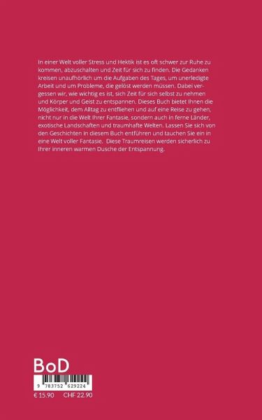 In einer Welt voller Stress und Hektik ist es oft schwer zur Ruhe zu kommen, abzuschalten und Zeit für sich zu finden. Die Gedanken kreisen unaufhörlich um die Aufgaben des Tages, um unerledigte Arbeit und um Probleme, die gelöst werden müssen. Dabei vergessen wir oft, wie wichtig es ist, sich Zeit für sich selbst zu nehmen und Körper und Geist zu entspannen. Dieses Buch bietet Ihnen die Möglichkeit, dem Alltag zu entfliehen und auf eine Reise zu gehen, nicht nur in die Welt Ihrer Fantasie, sondern auch in ferne Länder, exotische Landschaften und traumhafte Welten. Lassen Sie sich von den Geschichten in diesem Buch entführen und tauchen Sie ein in eine Welt voller Abenteuer und Entspannung. Jede Traumreise in diesem Buch ist so gestaltet, dass Sie sich voll und ganz darauf einlassen können. Egal, ob Sie sich nach Ruhe und Entspannung sehnen oder neue Energie und Inspiration suchen: hier finden Sie für jeden Bedarf eine passende Traumreise. Vorangestellt habe ich Infos über die erforderlichen Vorbereitungen für die Durchführung der Traumreisen, eine einfache Entspannungs-übung, eine einfache Atemübung sowie eine kurze Meditation. Diese Traumreisen werden sicherlich zu Ihrer inneren warmen Dusche der Entspannung.