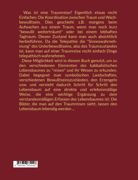 Was ist eine Traumreise? Eigentlich etwas recht Einfaches: Die Koordination zwischen Traum und Wachbewußtsein. Dies geschieht z.B. morgens beim Aufwachen aus einem Traum, wenn man noch kurz "bewußt weiterträumt" oder bei einem lebhaften Tagtraum. Diesen Zustand kann man auch absichtlich herbeiführen. Da die Telepathie die "Sinneswahrnehmung" des Unterbewußtseins, also des Traumzustandes ist, kann man auf einer Traumreise recht einfach Dinge telepathisch wahrnehmen. Diese Möglichkeit wird in diesem Buch genutzt, um zu den verschiedenen Elementen des kabbalistischen Lebensbaumes zu "reisen" und ihr Wesen zu erkunden. Dabei begegnet man symbolischen Landschaften, verschiedenen Bewußtseinszuständen, den Erzengeln usw. und versteht dadurch Schritt für Schritt den Lebensbaum auf eine direkte und erlebnismäßige Weise, die eine wichtige Ergänzung zu dem verstandesmäßigen Erfassen des Lebensbaumes ist: Die Bilder, die man auf den Traumreisen sieht, lassen den Lebensbaum lebendig werden ...