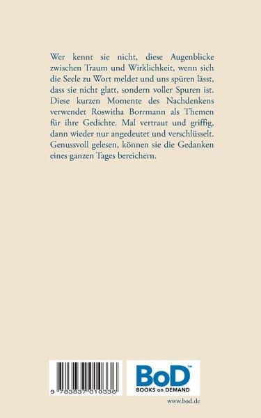 Wer kennt sie nicht, diese Augenblicke zwischen Traum und Wirklichkeit, wenn sich die Seele zu Wort meldet und uns spüren lässt, dass sie nicht glatt, sondern voller Spuren ist. Diese kurzen Momente des Nachdenkens verwendet Roswitha Borrmann als Themen für ihre Gedichte. Mal vertraut und griffig, dann wieder nur angedeutet und verschlüsselt. Genussvoll gelesen, können sie die Gedanken eines ganzen Tages bereichern.