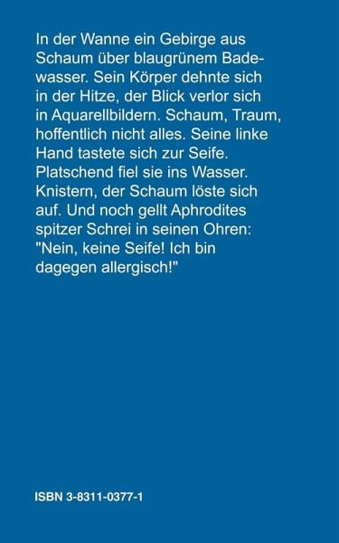 In der Wanne ein Gebirge aus Schaum über blaugrünem Badewasser. Sein Körper dehnte sich in der Hitze, der Blick verlor sich in Aquarellbildern. Schaum, Traum, hoffentlich nicht alles. Seine linke Hand tastete sich zur Seife. Platschend fiel sie ins Wasser. Knistern, der Schaum löste sich auf. Und noch gellt Aphrodites spitzer Schrei in seinen Ohren: "Nein, keine Seife! Ich bin dagegen allergisch!"
