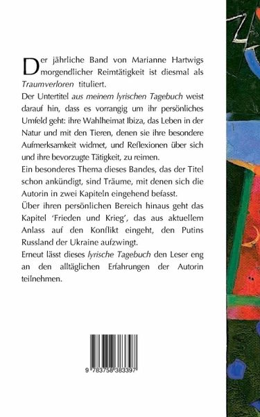Der jährliche Band von Marianne Hartwigs morgendlicher Reimtätigkeit ist diesmal als Traumverloren tituliert.Der Untertitel aus meinem lyrischen Tagebuch weist darauf hin, dass es vorrangig um ihr persönliches Umfeld geht: ihre Wahlheimat Ibiza, das Leben in der Natur und mit den Tieren, denen sie ihre besondere Aufmerksamkeit widmet, und Reflexionen über sich und ihre bevorzugte Tätigkeit, zu reimen.Ein besonderes Thema dieses Bandes, das der Titel schon ankündigt, sind Träume, mit denen sich die Autorin in zwei Kapiteln eingehend befasst.Über ihren persönlichen Bereich hinaus geht das Kapitel 'Frieden und Krieg', das aus aktuellem Anlass auf den Konflikt eingeht, den Putins Russland der Ukraine aufzwingt.Erneut lässt dieses lyrische Tagebuch den Leser eng an den alltäglichen Erfahrungen der Autorin teilnehmen.