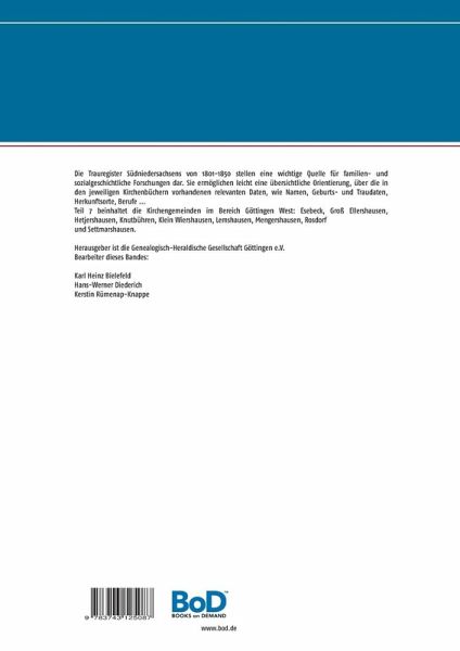 Die Trauregister Südniedersachsens von 1801-1850 stellen eine wichtige Quelle für familien- und sozialgeschichtliche Forschungen dar. Sie ermöglichen leicht eine übersichtliche Orientierung, über die in den jeweiligen Kirchenbüchern vorhandenen relevanten Daten, wie Namen, Geburts- und Traudaten, Herkunftsorte, Berufe ...Teil 7 beinhaltet die Kirchengemeinden im Bereich Göttingen West: Esebeck, Groß Ellershausen, Hetjershausen, Knutbühren, Klein Wiershausen, Lemshausen, Mengershausen, Rosdorf und Settmarshausen.Herausgeber ist die Genealogisch-Heraldische Gesellschaft Göttingen e.V.Bearbeiter dieses Bandes:Karl Heinz BielefeldHans-Werner DiederichKerstin Rümenap-Knappe
