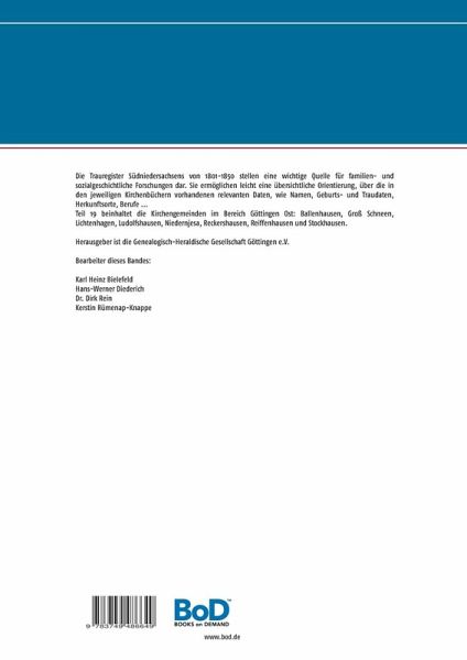 Die Trauregister Südniedersachsens von 1801-1850 stellen eine wichtige Quelle für familien- und sozialgeschichtliche Forschungen dar. Sie ermöglichen leicht eine übersichtliche Orientierung, über die in den jeweiligen Kirchenbüchern vorhandenen relevanten Daten, wie Namen, Geburts- und Traudaten, Herkunftsorte, Berufe ...Teil 19 beinhaltet die Kirchengemeinden im Bereich Göttingen Ost: Ballenhausen,Groß Schneen, Lichtenhagen, Ludolfshausen, Niedernjesa, Reckershausen, Reiffenhausen und Stockhausen.Herausgeber ist die Genealogisch-Heraldische Gesellschaft Göttingen e.V.Bearbeiter dieses Bandes:Karl Heinz BielefeldHans-Werner DiederichDr. Dirk ReinKerstin Rümenap-Knappe