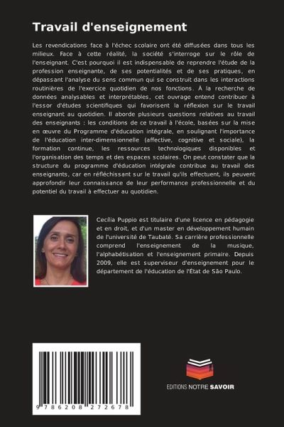 Les revendications face à l'échec scolaire ont été diffusées dans tous les milieux. Face à cette réalité, la société s'interroge sur le rôle de l'enseignant. C'est pourquoi il est indispensable de reprendre l'étude de la profession enseignante, de ses potentialités et de ses pratiques, en dépassant l'analyse du sens commun qui se construit dans les interactions routinières de l'exercice quotidien de nos fonctions. À la recherche de données analysables et interprétables, cet ouvrage entend contribuer à l'essor d'études scientifiques qui favorisent la réflexion sur le travail enseignant au quotidien. Il aborde plusieurs questions relatives au travail des enseignants : les conditions de ce travail à l'école, basées sur la mise en oeuvre du Programme d'éducation intégrale, en soulignant l'importance de l'éducation inter-dimensionnelle (affective, cognitive et sociale), la formation continue, les ressources technologiques disponibles et l'organisation des temps et des espaces scolaires. On peut constater que la structure du programme d'éducation intégrale contribue au travail des enseignants, car en réfléchissant sur le travail qu'ils effectuent, ils peuvent approfondir leur connaissance de leur performance professionnelle et du potentiel du travail à effectuer au quotidien.