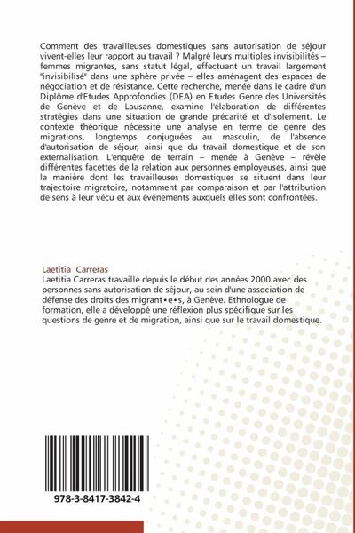 Comment des travailleuses domestiques sans autorisation de séjour vivent-elles leur rapport au travail ? Malgré leurs multiples invisibilités - femmes migrantes, sans statut légal, effectuant un travail largement "invisibilisé" dans une sphère privée - elles aménagent des espaces de négociation et de résistance. Cette recherche, menée dans le cadre d'un Diplôme d'Etudes Approfondies (DEA) en Etudes Genre des Universités de Genève et de Lausanne, examine l'élaboration de différentes stratégies dans une situation de grande précarité et d'isolement. Le contexte théorique nécessite une analyse en terme de genre des migrations, longtemps conjuguées au masculin, de l'absence d'autorisation de séjour, ainsi que du travail domestique et de son externalisation. L'enquête de terrain - menée à Genève - révèle différentes facettes de la relation aux personnes employeuses, ainsi que la manière dont les travailleuses domestiques se situent dans leur trajectoire migratoire, notamment par comparaison et par l'attribution de sens à leur vécu et aux événements auxquels elles sont confrontées.