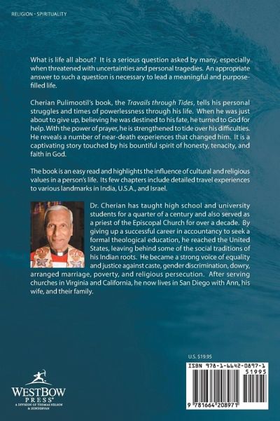 What is life all about? It is a serious question asked by many, especially when threatened with uncertainties and personal tragedies. An appropriate answer to such a question is necessary to lead a meaningful and purpose-filled life. Cherian Pulimootil's book, the Travails through Tides, tells his personal struggles and times of powerlessness through his life. When he was just about to give up, believing he was destined to his fate, he turned to God for help. With the power of prayer, he is strengthened to tide over his difficulties. He reveals a number of near-death experiences that changed him. It is a captivating story touched by his bountiful spirit of honesty, tenacity, and faith in God. The book is an easy read and highlights the influence of cultural and religious values in a person's life. Its few chapters include detailed travel experiences to various landmarks in India, U.S.A., and Israel.