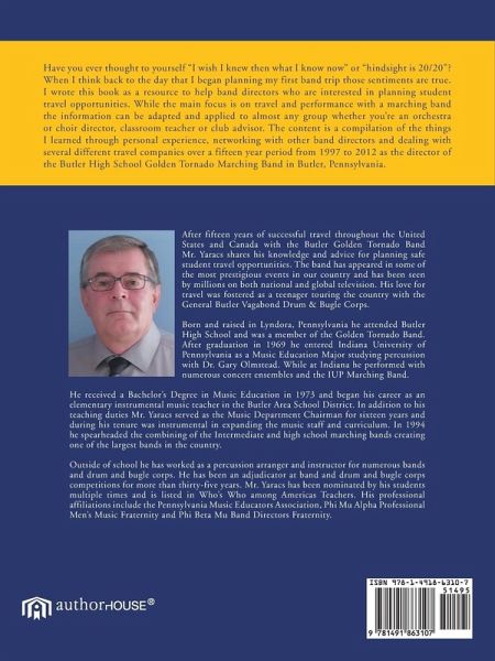 Have you ever thought to yourself "I wish I knew then what I know now" or "hindsight is 20/20"? When I think back to the day that I began planning my first band trip those sentiments are true. I wrote this book as a resource to help band directors who are interested in planning student travel opportunities. While the main focus is on travel and performance with a marching band the information can be adapted and applied to almost any group whether you're an orchestra or choir director, classroom teacher or club advisor. The content is a compilation of the things I learned through personal experience, networking with other band directors and dealing with several different travel companies over a fifteen year period from 1997 to 2012 as the director of the Butler High School Golden Tornado Marching Band in Butler, Pennsylvania.