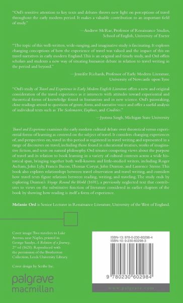 This study considers how a range of prose texts register, and help to shape, the early modern cultural debate between theoretical and experiential forms of knowledge as centered on the subject of travel.