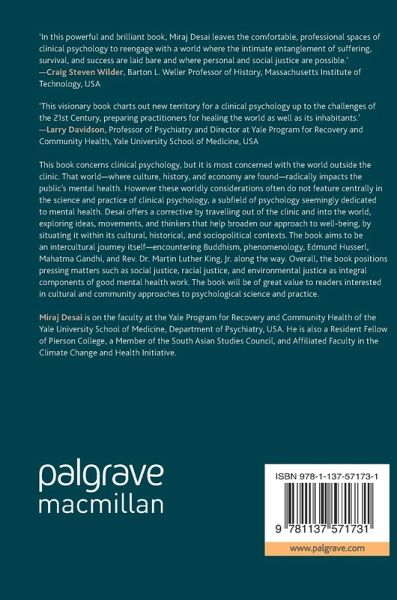 This book concerns clinical psychology, but it is most concerned with the world outside the clinic. That world-where culture, history, and economy are found-radically impacts the public's mental health. However these worldly considerations often do not feature centrally in the science and practice of clinical psychology, a subfield of psychology seemingly dedicated to mental health. Desai offers a corrective by travelling out of the clinic and into the world, exploring ideas, movements, and thinkers that help broaden our approach to well-being, by situating it within its cultural, historical, and sociopolitical contexts. The book aims to be an intercultural journey itself-encountering Buddhism, phenomenology, Edmund Husserl, Mahatma Gandhi, and Rev. Dr. Martin Luther King, Jr. along the way. Featuring a Foreword by Jeffrey Sachs, the book positions pressing matters such as social justice, racial justice, and environmental justice as integral components of good mental health work.The book will be of interest to readers interested in cultural and community approaches to psychological science and practice.