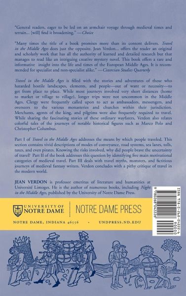 Travel in the Middle Ages is filled with the stories and adventures of those who hazarded hostile landscapes, elements, and people-out of want or necessity-to get from place to place. While most journeys involved very short distances (home to market or village to village), longer trips were not uncommon in the Middle Ages. Clergy were frequently called upon to act as ambassadors, messengers, and overseers to the various monasteries and churches within their jurisdiction. Merchants, agents of the king, and pilgrims were also frequently required to travel. While sharing the fascinating stories of these ordinary wayfarers, Verdon also relates colorful tales of the journeys of notable historical figures such as Marco Polo and Christopher Columbus. Part I of Travel in the Middle Ages addresses the means by which people traveled. This section contains vivid descriptions of modes of conveyance, road systems, sea lanes, tolls, taxes, and even pirates. Knowing the risks involved, why did people brave the uncertainty of travel? Part II of the book addresses this question by identifying five main motivational categories of medieval travel. Part III deals with travel myths, monsters, and fictitious journeys of medieval fantasy writers. Verdon concludes with a pithy critique of travel in the modern world. Appearing for the first time in an English translation, Travel in the Middle Ages will delight anyone with an interest in medieval culture or travel books.