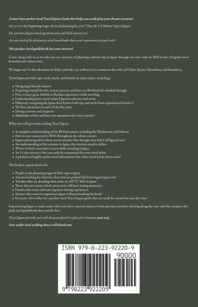 A must-have pocket-sized Travel Japan Guide that helps you easily plan your dream vacation! Are you in the beginning stages of travel planning for your "Once In A Lifetime" trip to Japan? Do you have Japan travel questions you can't find answers to? Are you tired of the dictionary-sized travel books that aren't convenient to travel with? Come along with us as we take you on a journey of planning a dream trip to Japan through our own visits in 2023 to five of Japan's most beautiful and robust cities. We begin our 11-day adventure in Tokyo and take you with us as we venture to the cities of Osaka, Tokyo, Kyoto, Hiroshima, and Kamakura. Travel Japan provides tips, tricks, hacks, and details on many topics, including:Navigating Haneda Airport Preparing yourself for the customs process and how to effortlessly be whisked through How to have great Airbnb or Ryokan experiences while traveling Understanding basic travel-related Japanese phrases and terms Efficiently navigating the Japan Rail System with tips and tricks from experienced travelers! The best attractions in each of the five cities Dining customs and etiquette Multitudes of free and low-cost attractions for every traveler! What you will gain from reading Travel Japan:A complete understanding of the JR Rail system, including the Shinkansen and Subway How to stay connected to WiFi throughout the whole country Expert planning advice from recent travelers that thought they had it all figured out! An understanding of the customs in Japan that travelers need to follow Where to find convenience items while traveling in Japan An 11-day itinerary that can easily be customized for your travel plans A plethora of highly useful travel information that other travel books don't cover! This book is a great choice for:People in the planning stages of their trip to Japan Anyone looking for itinerary ideas that are packed full from beginning to end Travelers that are deciding what cities are MUST SEE in Japan Those that are unsure which attractions will leave lasting memories Foodies that want authentic Japanese dining experiences Anyone that wants to experience Japan without breaking the bank! Everyone who wishes for a pocket-sized Travel Japan guide that can easily be carried on your day trips! Experiencing Japan is much easier when you have a proven itinerary from previous travelers advising along the way, and this compact day-pack-sized guidebook does exactly that! Travel Japan provides you with the groundwork to plan your itinerary your way. Your wallet (and walking shoes) will thank you!