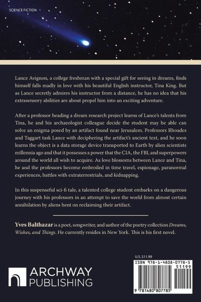 Lance Avignon, a college freshman with a special gift for seeing in dreams, finds himself falls madly in love with his beautiful English instructor, Tina King. But as Lance secretly admires his instructor from a distance, he has no idea that his extrasensory abilities are about propel him into an exciting adventure. After a professor heading a dream research project learns of Lance's talents from Tina, he and his archaeologist colleague decide the student may be able can solve an enigma posed by an artifact found near Jerusalem. Professors Rhoades and Taggart task Lance with deciphering the artifact's ancient text, and he soon learns the object is a data storage device transported to Earth by alien scientists millennia ago and that it possesses a power that the CIA, the FBI, and superpowers around the world all wish to acquire. As love blossoms between Lance and Tina, he and the professors become embroiled in time travel, espionage, paranormal experiences, battles with extraterrestrials, and kidnapping. In this suspenseful sci-fi tale, a talented college student embarks on a dangerous journey with his professors in an attempt to save the world from almost certain annihilation by aliens bent on reclaiming their artifact.