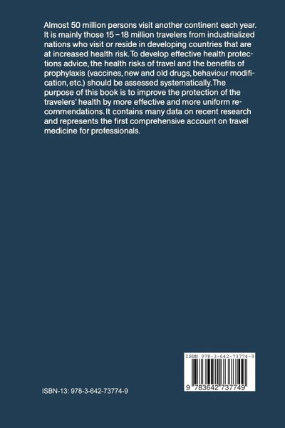 Almost 50 million persons visit another continent each year. It is mainly those 15-18 million travelers from industrialized nations who visit or reside in developing countries that are at increased health risk. To develop effective health protection advice, the health risks of travel and the benefits of prophylaxis (vaccines, new and old drugs, behaviour modification, etc.) should be assessed systematically. The purpose of this book is to improve the protection of the travelers' health by more effective and more uniform recommendations. It contains many data on recent research and represents the first comprehensive account on travel medicine for professionals.