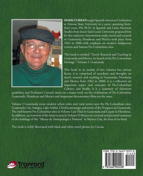 This book is entitled Travel, Research, and Teaching in Guatemala and Mexico: In Search of the Pre-Columbian Heritage (volume I, Guatemala). This book in its totality of two volumes has various facets: it is comprised of anecdotes and thoughts on travel, research, and teaching in Guatemala, Honduras, and Mexico from 1962 to 2000; it is a reflection on important topics and concepts of pre-Columbian culture, and finally, it is a summary of classroom guidelines and Professor Curran's notes on a major work on the civilizations of pre-Columbian Guatemala, Honduras, and Mexico and important documentary films on the same. Volume I treats Guatemala and Honduras. Again, volume I on Guatemala treats modern urban cities and rural towns near the pre-Columbian sites: Guatemala City, Antigua, Lake Atitlán, Chichicastenango, and towns of the Verapaces in Guatemala. The well-known pre-Columbian sites in volume I are Copán in Honduras and Tikal in Guatemala. In addition, an overview of the latter is seen in a textual and pictorial summary of the holdings of the Museo de Antropología e Historia in Mexico City, the best of its kind. The book is richly illustrated with black-and-white travel photos by Curran.
