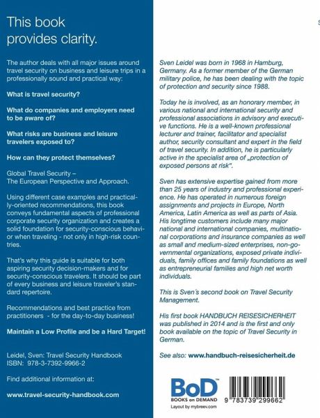 This book provides clarity.The author deals with all major issues around travel security on business and leisure trips in a professionally sound and practical way:What is travel security?What do companies and employers need to be aware of?What risks are business and leisure travelers exposed to?How can they protect themselves?Global Travel Security? A European Perspective and Approach.Using different case examples and practically-oriented recommendations, this book conveys fundamental aspects of professional corporate security organization and creates a solid foundation for security-conscious behavior when traveling - not only in high-risk countries.That's why this guide is suitable for both aspiring security decision-makers and for security-conscious travelers. It should be part of every business and leisure traveler's standard repertoire.Recommendations and best practice from practitioners - for the day-to-day business!Maintain a Low Profile and be a Hard Target!