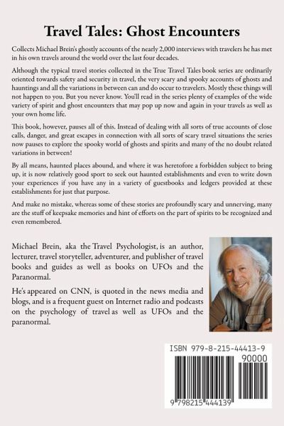 Travel Tales: Ghost Encounters Collects Michael Brein's ghostly accounts of the nearly 2,000 interviews with travelers he has met in his own travels around the world over the last four decades. Although the typical travel stories collected in the True Travel Tales book series are ordinarily oriented towards safety and security in travel, the very scary and spooky accounts of ghosts and hauntings and all the variations in between can and do occur to travelers. Mostly these things will not happen to you. But you never know. You'll read in the series plenty of examples of the wide variety of spirit and ghost encounters that may pop up now and again in your travels as well as your own home life. This book, however, pauses all of this. Instead of dealing with all sorts of true accounts of close calls and great escapes in connection with all sorts of scary travel situations including chases, foiled kidnappings, attacks, roadblocks, scary places, trips from hell, borders, and police, hitchhiking, international spying, smuggling, and intrigue, being in the wrong places at the wrong times, terror attacks, bandits, Mexican standoffs, airplane crashes, accidents and mishaps, white slavery, robberies, sexual harassment and assaults and more — the series now pauses to explore the spooky world of ghosts and spirits and many of the no doubt related variations in between! Instead of reading about the dangers and mishaps of others, whereby you'll focus on and gain healthier respect for the true dangers and risks of travel and adventure... the point of this book is purely to explore a virtually little known aspect of reality. By all means, haunted places abound, and where it was heretofore a forbidden subject to bring up, it is now relatively good sport to seek out haunted establishments and even to write down your experiences in a variety of guestbooks and ledgers provided at these establishments for just that purpose. And make no mistake, whereas some of these stories are profoundly scary and unnerving, many are the stuff of keepsake memories and smack of efforts on the part of spirits to be recognized and even be remembered. Many of the scary accounts of travelers in this book are tales of times gone by. Many ghosts seem to be intent on making others remember them. Other ghost experiences seem to be never-ending repeating replays of cycles of discarnate entities seemingly trying to resolve conflicts of times long gone by. Yes, indeed, we are often the recipients of visits from ghosts and spirits on our own home turfs. It, therefore, behooves us to think of this book as not only a compendium of ghostly visits that we seek out or experience despite ourselves in our travels, but perhaps we ought to consider the visits of ghosts and spirits as similarly traveling themselves in a way from their own alternate space-time realities which conjoin or overlap with ours in one massive Contiguous Universe? In this Reader or compendium of ghost and spirit tales, we broaden our look at not merely what we think of as the typical shadows, spirits, or apparitions reported by so many, but also to a much broader reality of similarly related behaviors of presumably a wide variety discarnate supernatural entities that cut across in mysterious ways broad swaths of what we may typically refer to as ghost or spirit visitations and their interactions with us. Such ghostly encounters may not ever happen expressly to you, but assuredly something strange of an apparitional manifestation will invariably happen to a friend, a neighbor, or perhaps even a relative.