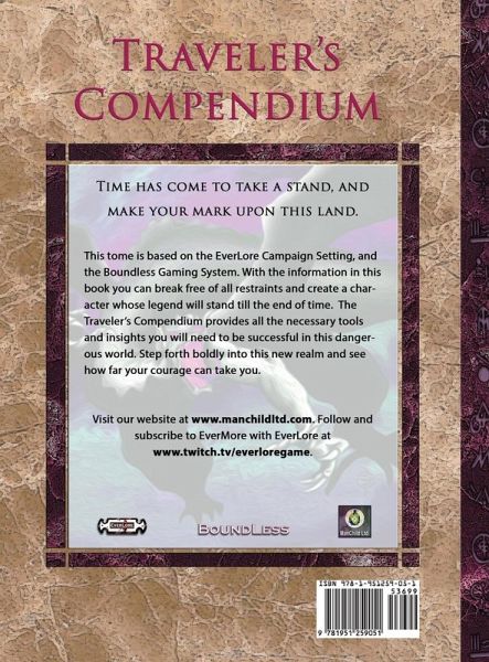 This tome offers everything you need to know about creating mighty characters equipped to survive adventures on Mythandria, or anywhere else in the realm. EverLore is an interactive storytelling game that builds a solid foundation of devious monsters, nefarious factions, hidden treasures and ancient powers upon which your imagination can soar without limits. This book is based on the EverLore Campaign Setting and the BoundLess Gaming System, developed by David Thompson, founder of ManChild, Ltd. This new system does not rely on levels or classes, so players can Game Without Limits.