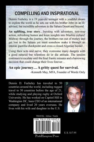 Dennis Feeheley is a 19 year-old teenager with a youthful dream to explore the world when he sets out with his brother John on an ill-advised, but incredible adventure to The Sahara Desert and beyond.... The year is 1977. It is long before the internet, cell phones, fax machines or ATMs. Much of the world is truly a mysterious place when the young brothers meet up in London to travel across Western Europe before crossing the Mediterranean Sea, and trekking across part of the Sahara Desert in Africa, and then back to London - All on $6 a day.... 'Travelin Man' is a true story bursting with adventure, heart-stopping action, unexpected humor, keen insights into Muslim culture, and a vivid portrayal of perseverance over adversity. With no maps, little planning, and less money; a fateful decision is made that sets the brothers off on the adventure of a lifetime.... Midway through the journey after stowing away on a ship across the Mediterranean Sea, the young brothers get lost out in the vast Sahara and desperately run out of money. Yet they must still somehow make it through a dangerous guerilla checkpoint and cross a closed Algerian-Moroccan border. An underlying tension builds to the final, frantic minutes and a harrowing decision that could change one of the brother's lives forever.... Throughout the compelling story, the will and determination of the human spirit shines. The brothers use their wits and nerve to overcome many dangerous obstacles with a good natured, but relentless do or die attitude. Although they make a truckload of mistakes, with youthful optimism and determination they just grit it out and do what they have got to do.... During their adventure they hide on trains; travel by foot, tractor, camel and hitch-hike over 1,000 miles through The Sahara Desert. They also experience traditional Muslim culture in the remote villages of the Sahara where, with few exceptions, they are treated with great kindness. An array of fascinating characters cross the tr
