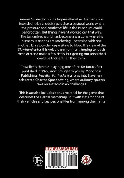 Aramis Subsector on the Imperial Frontier. Aramanx was intended to be a luddite paradise, a pastoral world where the pressure and conflict of life in the Imperium could be forgotten. But things haven't worked out that way. The balkanised world has become a war zone where its numerous nations are ratcheting up tension with one another. It is a powder keg waiting to blow. The crew of the Slowhand enter this volatile environment, hoping to repair their ship and make a few deals, but getting out unscathed could be trickier than they think. Traveller is the role-playing game of the far future, first published in 1977, now brought to you by Mongoose Publishing. Traveller: Far Trader is a foray into Traveller's celebrated Charted Space setting, where ordinary spacers take on extraordinary challenges. This issue also includes bonus material for the game that describes the Helical mercenary unit with stats for one of their vehicles and key personalities from among