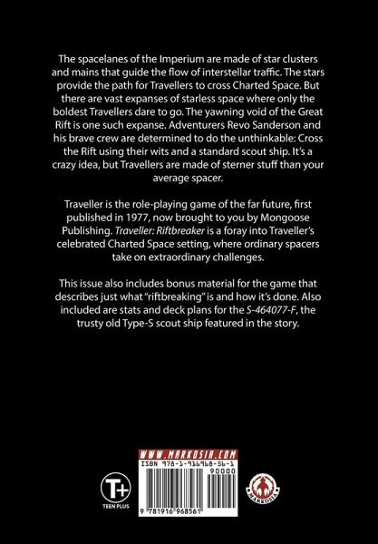The space lanes of the Imperium are made of star clusters and mains that guide the flow of interstellar traffic. The stars provide the path for Travellers to cross Charted Space. But there are vast expanses of starless space where only the boldest Travellers dare to go. The yawning void of the Great Rift is one such expanse. Adventurers Revo Sanderson and his brave crew are determined to do the unthinkable: Cross the Rift using their wits and a standard scout ship. It's a crazy idea, but Travellers are made of sterner stuff than your average spacer. Traveller is the role-playing game of the far future, first published in 1977, now brought to you by Mongoose Publishing. Traveller: Riftbreaker is a foray into Traveller's celebrated Charted Space setting, where ordinary spacers take on extraordinary challenges. This issue also includes bonus material for the game that describes just what "riftbreaking" is and how it's done. Also included are stats and deck plans for the S-464077-F, the trusty old Type-S scout ship featured in the story.