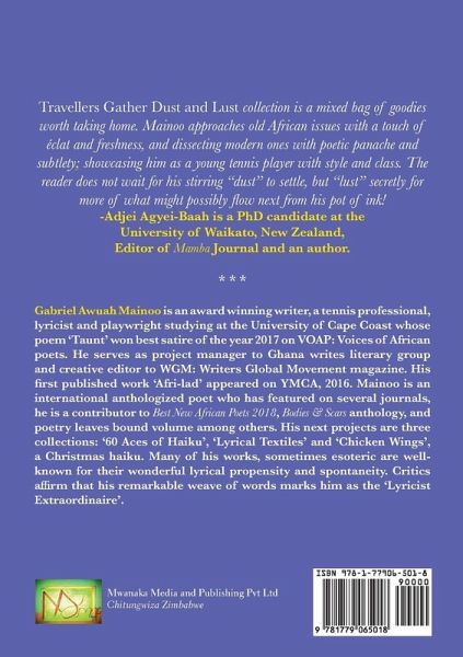 Gabriel Awuah Mainoo is an award winning writer, a tennis professional, lyricist and playwright studying at the University of Cape Coast whose poem 'Taunt' won best satire of the year 2017 on VOAP: Voices of African poets. He serves as project manager to Ghana writes literary group and creative editor to WGM: Writers Global Movement magazine. His first published work 'Afri-lad' appeared on YMCA, 2016. Mainoo is an international anthologized poet who has featured on several journals, he is a contributor to Best New African Poets 2018, Bodies & Scars anthology, and poetry leaves bound volume among others. His next projects are three collections: '60 Aces of Haiku', 'Lyrical Textiles' and 'Chicken Wings', a Christmas haiku. Many of his works, sometimes esoteric are well-known for their wonderful lyrical propensity and spontaneity. Critics affirm that his remarkable weave of words marks him as the 'Lyricist Extraordinaire'.