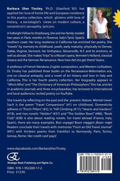 Barbara Sher Tinsley, Ph.D. (Stanford '83) has applied her love of home life and European residence in this poetry collection, which glistens with love of history, a sociologist's views on modern culture, a romanticist's sensuality, lyricism. A Fulbright Fellow to Strasbourg, she and her family resided two years in Paris; months in Florence, Italy's Tyrol, Spain's southern coast. Her long residence in California has enriched her poetry. She "travels" by memory to childhood, youth, early maturity; physically to Denver, Dallas, Virginia, Vermont, her birthplace, Gloversville, N.Y. and its environs, as well as abroad. She makes "trips" to a Mozart opera, Vermeer's Holland, classical Greece and the German Renaissance. Now how did she get there? Guess. A professor of French literature, English composition, and Western civilization, Dr. Tinsley has published three books on the Renaissance-Reformation era, one on classical antiquity, and a novel of art history and love In Italy and California. This is her fourth poetry collection. Her biography appears in "Who's Who" and "The Dictionary of American Philosophers." She has articles in academic journals and three encyclopedias; has lectured to international and local audiences; recited poetry on YouTube. She travels by reflecting on the past and the present. Nature. Mental travel. Such is the poem "Travel Companions" (#1) on childhood. Domesticity adheres in "Porch Pillars" (#2); in "Hill Climbing (#17); "Hearts and Gardens" (#18), and two novels: "Holden" (#37) and "The Golden Bowl," (#86). "Book Club" (#28) is also about reading novels. For travel abroad (France, Italy, Spain), there are many examples. Bon voyage! Buon viaggio! ¡Buen viaje! Readers conclude their travels with memories "From an Old Travel Journal" (#91) with thirteen poems from Frankfurt to Normandy, Paris, Torino, Genoa, Rome. Her credit card pays!