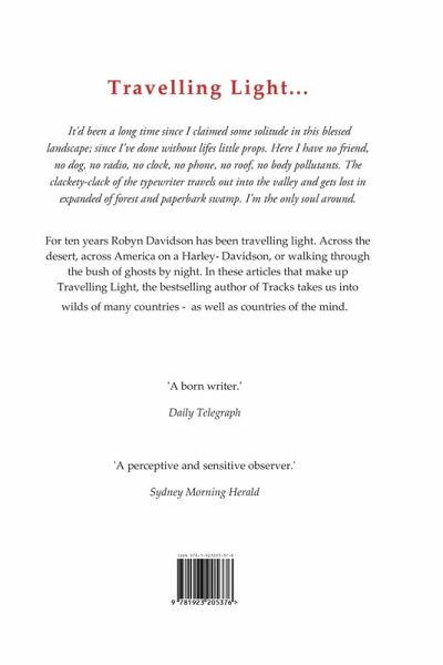 It'd been a long time since I claimed some solitude in this blessed landscape; since I've done without lifes little props. Here I have no friend, no dog, no radio, no clock, no phone, no roof, no body pollutants. The clackety-clack of the typewriter travels out into the valley and gets lost in expanses of forest and paperbark swamp. I'm the only soul around. For ten years Robyn Davidson has been travelling light. Across the desert, across America on a Harley-Davidson, or walking through the bush of ghosts by night. In these articles that make up Travelling Light, the bestselling author of Tracks takes us into wilds of many countries - as well as countries of the mind. 'A born writer.' - Daily Telegraph 'A perceptive and sensitive observer.' - Sydney Morning Herald