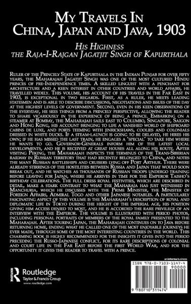First published in 2006. This unique perspective on China, Japan, and Java is written by His Highness the Indian Raja-I-Rajgan Jagatjit Singh of Kapurthala as a record of his brief visit to the Far East for the intimate presentation to his friends. This is less an academic analysis, and more a documentation of personal impressions and experiences in his destinations. The Raja-I-Rajgan Jagatjit Singh writes at the turn-of the- century when public interest had turned towards the course of the Russo-Japanese War of 1904-05, where battles were fought over dominance in Korea and Manchuria. This circumstance, as well as the author's royal position, allow for a particularly fascinating take on travel in this part of the world.