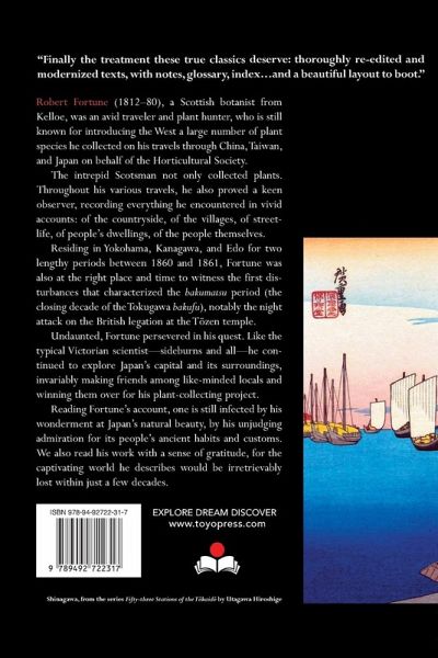 Robert Fortune (1812-80), a Scottish botanist from Kelloe, was an avid traveler and plant hunter, who is still known for introducing the West a large number of plant species he collected on his travels through China, Taiwan, and Japan on behalf of the Horticultural Society. The intrepid Scotsman not only collected plants. Throughout his various travels, he also proved a keen observer, recording everything he encountered in vivid accounts: of the countryside, of the villages, of street-life, of people's dwellings, of the people themselves. Residing in Yokohama, Kanagawa, and Edo for two lengthy periods between 1860 and 1861, Fortune was also at the right place and time to witness the first disturbances that characterized the bakumatsu period (the closing decade of the Tokugawa bakufu), notably the night attack on the British legation at the Tôzen temple. Undaunted, Fortune persevered in his quest. Like the typical Victorian scientist-sideburns and all-he continued to explore Japan's capital and its surroundings, invariably making friends among like-minded locals and winning them over for his plant-collecting project. Reading Fortune's account, one is still infected by his wonderment at Japan's natural beauty, by his unjudging admiration for its people's ancient habits and customs. We also read his work with a sense of gratitude, for the captivating world he describes would be irretrievably lost within just a few decades.