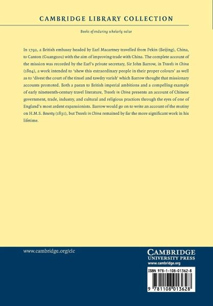 In 1792, a British embassy headed by Earl Macartney travelled from Peking (Beijing), China, to Canton (Guangzou) with the aim of improving trade with China. The complete account of the mission was recorded by the Earl's private secretary, Sir John Barrow, in Travels in China (1804), a work intended to 'shew this extraordinary people in their proper colours' as well as to 'divest the court of the tinsel and tawdry varish' which Barrow thought that missionary accounts promoted. Both a paean to British imperial ambitions and a compelling example of early nineteenth-century travel literature, Travels in China presents an account of Chinese government, trade, industry, and cultural and religious practices through the eyes of one of England's most ardent expansionists. Barrow would go on to write an account of the mutiny on H.M.S. Bounty (1831), but Travels in China remained by far the more significant work in his lifetime.