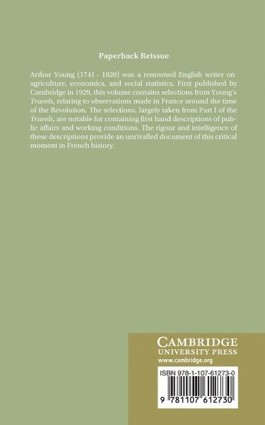 First published by Cambridge in 1929, this volume contains selections from Travels in France by Arthur Young (1741 1820), a renowned English writer on agriculture, economics, and social statistics. These first-hand descriptions of public affairs and working conditions provide an unrivalled document of this critical moment in French history.